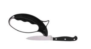 Passo 1 – Segure o afiador com os dedos dentro do protetor de dedos e o polegar apoiado contra o protetor de polegar.