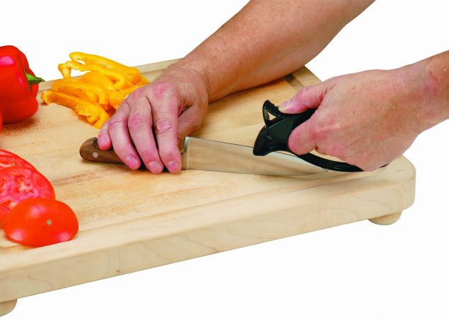 CUIDADO: A afiação de facas é uma atividade inerentemente perigosa. Utilizado corretamente, este afiador não o poderá magoar, mas uma lâmina ou objeto pontiagudo manuseado descuidadamente pode.