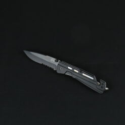 A nossa navalha de Resgate apresenta o logotipo da milícia numa das laterais da lâmina preta. A lâmina é em 3Cr13 de abertura bidextra. Tem trinco de segurança bidextro. No cabo da navalha tem quebra-vidros e corta cintos. Possui entalhes de serra para corte de cordas. Numa das laterais do punho tem um clip para que possa trazer a navalha presa no seu vestuário ou no seu equipamento.