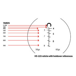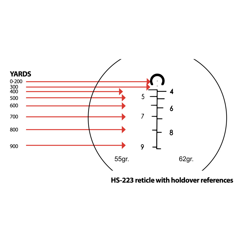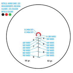 - Retículo balístico em formato de ferradura para o cartucho .223/5,56